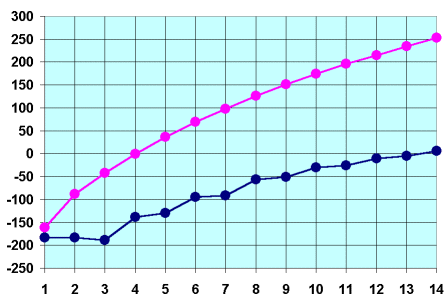 English: Melting points (in blue) and boiling points (in pink) of the first fourteen alkanes (temperatures in °C, number of carbon atoms along the horizontal axis)