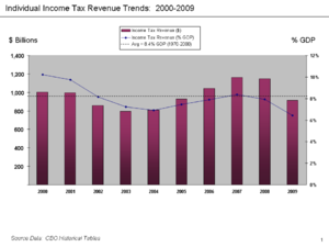 - Since the Bush tax cuts in 2001 and 2003, federal individual income taxes have remained below the 8.4% GDP level (the average from 1970-2000) with the exception of 2007.