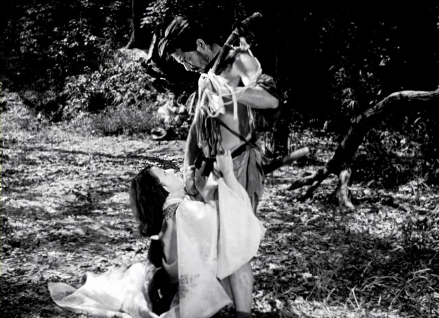 English: screenshot from Rashomon 1950 film 31:31 min. Toshirō Mifune as bandit Tajōmaru is standing, Machiko Kyō as Masago is kneeling and Masayuki Mori as samurai Kanazawa-no-Takehiro is sitting in the background