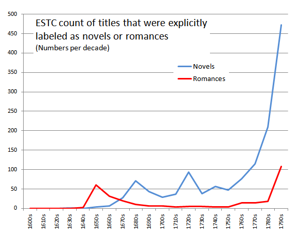 English: ESTC count of titles (per decade) that were explicitly labelled as "romances" or "novels" 1600-1800