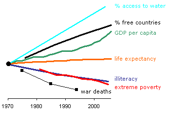 English: Key developments in the world with 1970 as base year. Water: estimated % of third world inhabitants with access to safe water. See File:Access to drinking water in third world small.GIF.