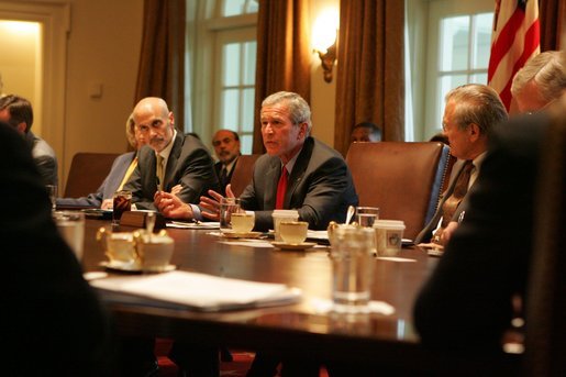 Description Flanked by Michael Chertoff, Secretary of Homeland Security, left, and Secretary of Defense Donald Rumsfeld, President George W. Bush meets with members of the White House Task Force on Hurricane Katrina Recovery in the Cabinet Room of the White House.