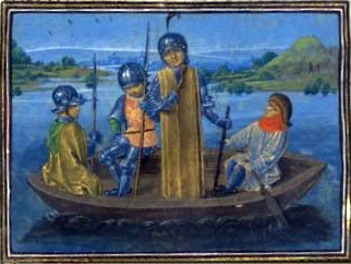 English: Richard II's court favourite Robert de Vere fleeing Radcot Bridge after the 1387 battle; taken from the Gruthuse manuscript of Froissart's Chroniques (ca. 1475).
