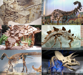 | A collection of fossil dinosaur skeletons. Clockwise from top left: Microraptor gui (a winged theropod), Apatosaurus louisae (a giant sauropod), Stegosaurus stenops (a plated stegosaur), Triceratops horridus (a horned ceratopsian), Edmontosaurus regalis (a duck-billed ornithopod), Gastonia burgei (an armored ankylosaur). | |