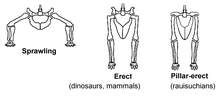 Dinosaurs stand erect in a manner similar to most modern mammals, but distinct from most other reptiles, whose limbs sprawl out to either side. This posture is due to the development of a laterally facing recess in the pelvis (usually an open socket) and a corresponding inwardly facing distinct head on the femur. Their erect posture enabled early dinosaurs to breathe easily while moving, which likely permitted stamina and activity levels that surpassed those of "sprawling" reptiles. Erect limbs probably also helped support the evolution of large size by reducing bending stresses on limbs. Some non-dinosaurian archosaurs, including rauisuchians, also had erect limbs but achieved this by a "pillar erect" configuration of the hip joint, where instead of having a projection from the femur insert on a socket on the hip, the upper pelvic bone was rotated to form an overhanging shelf.