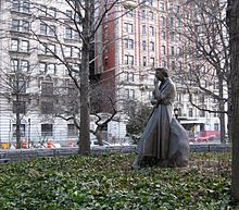 The Eleanor Roosevelt Monument, in New York's Riverside Park, was dedicated in 1996. It is said to be the first monument to an American president's wife. The centerpiece is a statue sculpted by Penelope Jencks. The surrounding granite pavement contains inscriptions designed by the architect Michael Middleton Dwyer, including a summary of her achievements, and a quote from her 1958 speech at the United Nations advocating universal human rights.