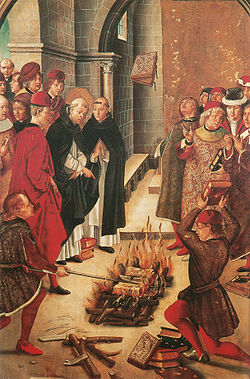 An image frequently misinterpreted as the Spanish Inquisition burning prohibited books. This is actually Pedro Berruguete's La Prueba del Fuego (1400s). It depicts a legend of St Dominic's dispute with the Cathars: they both consign their writings into the flames, and while the Cathars' text burn, St Dominic's miraculously leaps from the flames.
