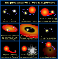 The model for the formation of this category of supernova is a closed binary star system. The larger of the two stars is the first to evolve off the main sequence, and it expands to form a red giant. The two stars now share a common envelope, causing their mutual orbit to shrink. The giant star then sheds most of its envelope, losing mass until it can no longer continue nuclear fusion. At this point it becomes a white dwarf star, composed primarily of carbon and oxygen. Eventually the secondary star also evolves off the main sequence to form a red giant. Matter from the giant is accreted by the white dwarf, causing the latter to increase in mass. Despite widespread acceptance of the basic model, the exact details of initiation and of the heavy elements produced in the explosion are still unclear.