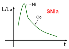 Type Ia supernovae follow a characteristic light curve—the graph of luminosity as a function of time—after the explosion. This luminosity is generated by the radioactive decay of nickel-56 through cobalt-56 to iron-56. The peak luminosity of the light curve is extremely consistent across normal Type Ia supernovae, having a maximum absolute magnitude of about −19.3. This allows them to be used as a secondary standard candle to measure the distance to their host galaxies.