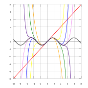 Pictured on the right is an accurate approximation of sin(x) around the point a = 0. The pink curve is a polynomial of degree seven: