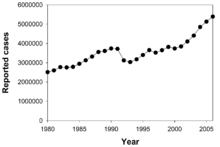 Roughly one-third of the world's population has been infected with M. tuberculosis, and new infections occur at a rate of one per second on a global scale. However, most infections with M. tuberculosis do not cause TB disease, and 90–95% of infections remain asymptomatic. In 2007, there were an estimated 13.7 million chronic active cases. In 2010, there were 8.8 million new cases of TB diagnosed, and 1.45 million deaths, most of these occurring in developing countries. Of these 1.45 million deaths, about 0.35 million occur in those coinfected with HIV.