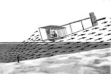 Orville at Kitty Hawk with the 1901 glider, its nose pointed skyward; it had no tail.
