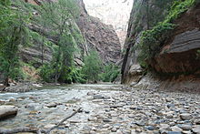 Streams in the area take rectangular paths because they follow jointing planes in the rocks. The stream gradient of the Virgin River, whose North Fork flows through Zion Canyon in the park, ranges from 50 to 80 feet (15 to 24 m) per mile (0.9–1.5%)—one of the steepest stream gradients in North America.